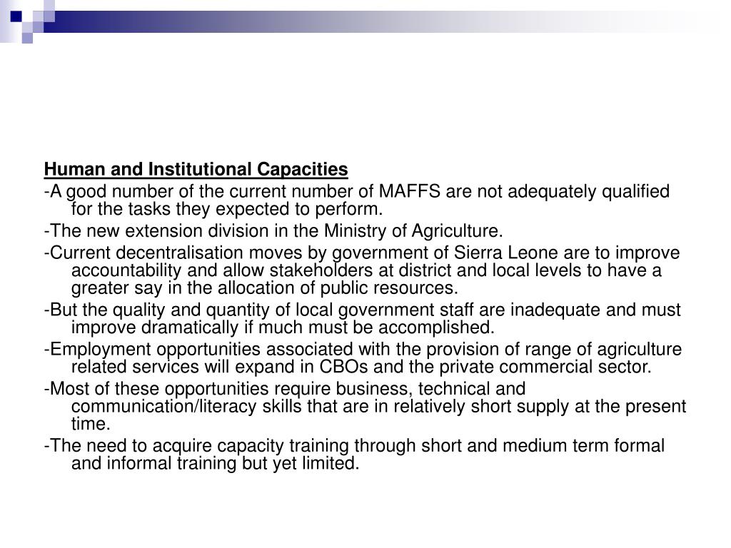Human and Institutional Capacities -A good number of the current number of MAFFS are not adequately qualified for the tasks they expected to perform. -The new extension division in the Ministry of Agriculture. -Current decentralisation moves by government of Sierra Leone are to improve accountability and allow stakeholders at district and local levels to have a greater say in the allocation of public resources. -But the quality and quantity of local government staff are inadequate and must improve dramatically if much must be accomplished. -Employment opportunities associated with the provision of range of agriculture related services will expand in CBOs and the private commercial sector. -Most of these opportunities require business, technical and communication/literacy skills that are in relatively short supply at the present time. -The need to acquire capacity training through short and medium term formal and informal training but yet limited.