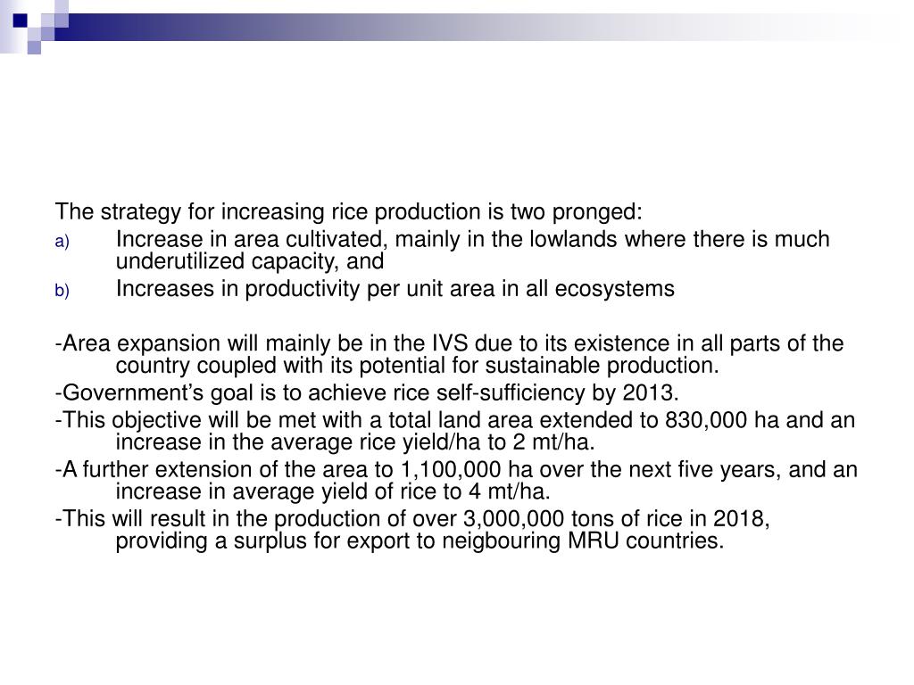 The strategy for increasing rice production is two pronged: • Increase in area cultivated, mainly in the lowlands where there is much underutilized capacity, and • Increases in productivity per unit area in all ecosystems -Area expansion will mainly be in the IVS due to its existence in all parts of the country coupled with its potential for sustainable production. -Government’s goal is to achieve rice self-sufficiency by 2013. -This objective will be met with a total land area extended to 830,000 ha and an increase in the average rice yield/ha to 2 mt/ha. -A further extension of the area to 1,100,000 ha over the next five years, and an increase in average yield of rice to 4 mt/ha. -This will result in the production of over 3,000,000 tons of rice in 2018, providing a surplus for export to neigbouring MRU countries.