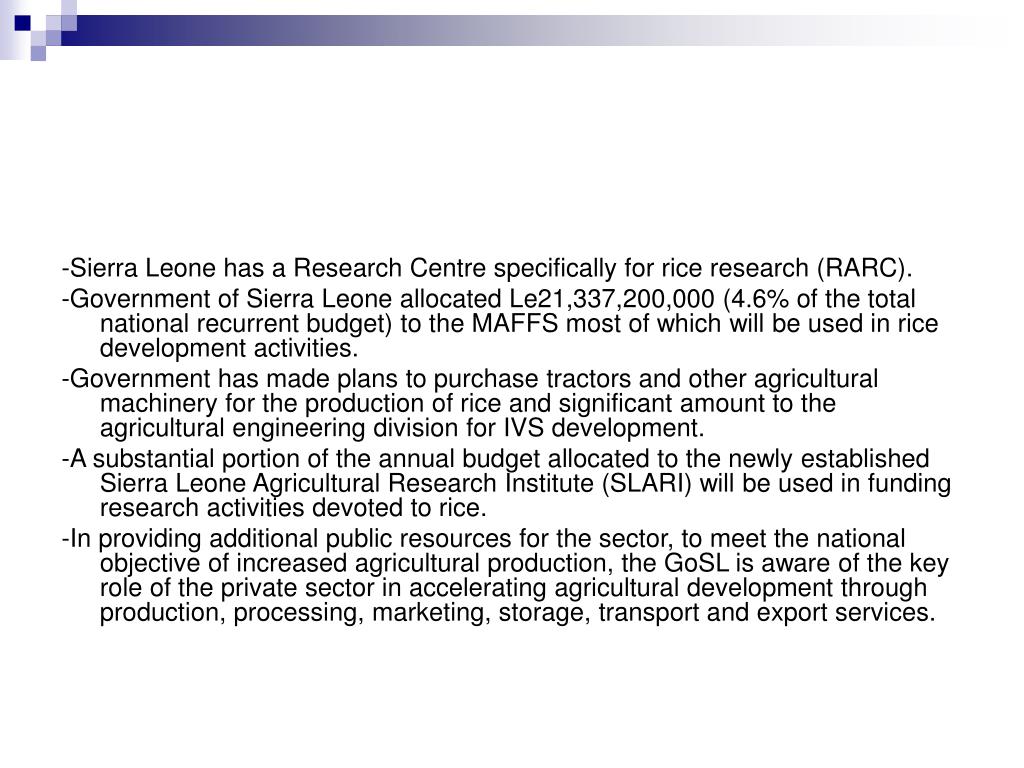 -Sierra Leone has a Research Centre specifically for rice research (RARC). -Government of Sierra Leone allocated Le21,337,200,000 (4.6% of the total national recurrent budget) to the MAFFS most of which will be used in rice development activities. -Government has made plans to purchase tractors and other agricultural machinery for the production of rice and significant amount to the agricultural engineering division for IVS development. -A substantial portion of the annual budget allocated to the newly established Sierra Leone Agricultural Research Institute (SLARI) will be used in funding research activities devoted to rice. -In providing additional public resources for the sector, to meet the national objective of increased agricultural production, the GoSL is aware of the key role of the private sector in accelerating agricultural development through production, processing, marketing, storage, transport and export services.
