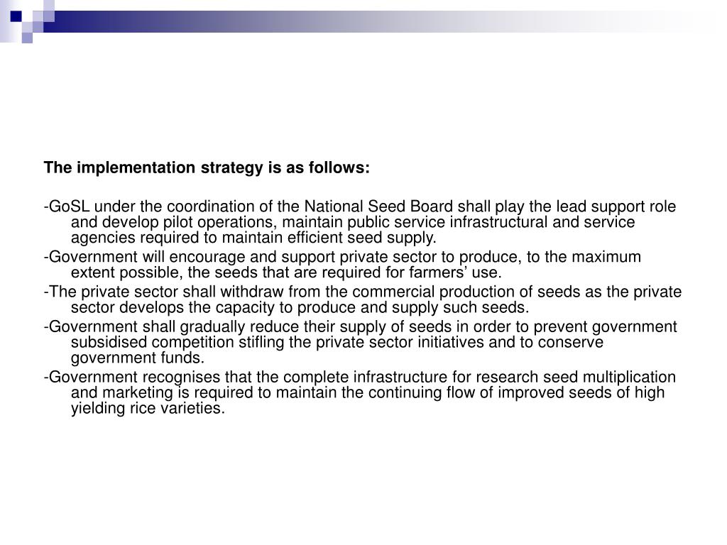 The implementation strategy is as follows: -GoSL under the coordination of the National Seed Board shall play the lead support role and develop pilot operations, maintain public service infrastructural and service agencies required to maintain efficient seed supply. -Government will encourage and support private sector to produce, to the maximum extent possible, the seeds that are required for farmers’ use. -The private sector shall withdraw from the commercial production of seeds as the private sector develops the capacity to produce and supply such seeds. -Government shall gradually reduce their supply of seeds in order to prevent government subsidised competition stifling the private sector initiatives and to conserve government funds. -Government recognises that the complete infrastructure for research seed multiplication and marketing is required to maintain the continuing flow of improved seeds of high yielding rice varieties.