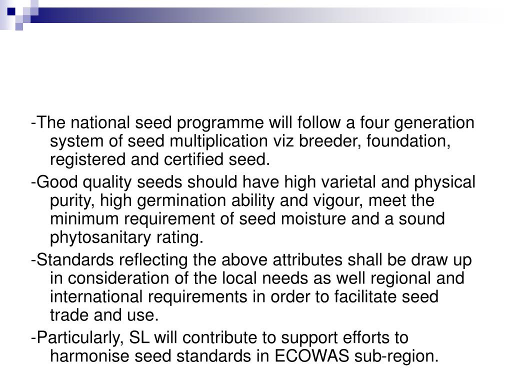 -The national seed programme will follow a four generation system of seed multiplication viz breeder, foundation, registered and certified seed. -Good quality seeds should have high varietal and physical purity, high germination ability and vigour, meet the minimum requirement of seed moisture and a sound phytosanitary rating. -Standards reflecting the above attributes shall be draw up in consideration of the local needs as well regional and international requirements in order to facilitate seed trade and use. -Particularly, SL will contribute to support efforts to harmonise seed standards in ECOWAS sub-region.