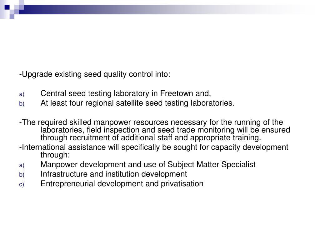 -Upgrade existing seed quality control into: • Central seed testing laboratory in Freetown and, • At least four regional satellite seed testing laboratories. -The required skilled manpower resources necessary for the running of the laboratories, field inspection and seed trade monitoring will be ensured through recruitment of additional staff and appropriate training. -International assistance will specifically be sought for capacity development through: • Manpower development and use of Subject Matter Specialist • Infrastructure and institution development • Entrepreneurial development and privatisation