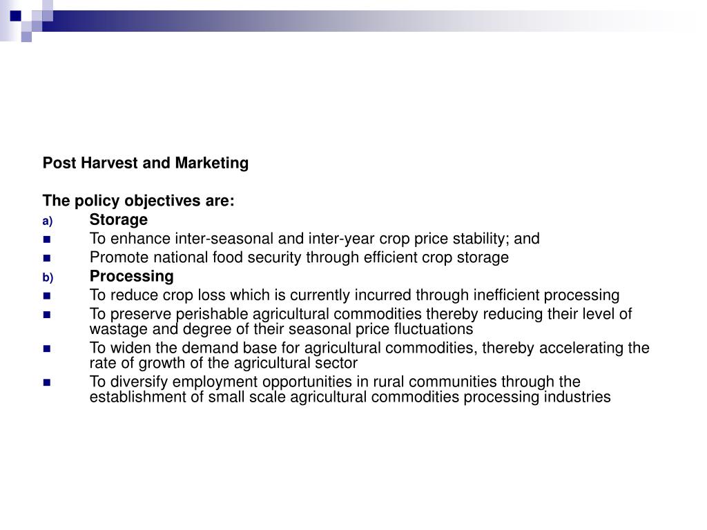 Post Harvest and Marketing The policy objectives are: • Storage • To enhance inter-seasonal and inter-year crop price stability; and • Promote national food security through efficient crop storage • Processing • To reduce crop loss which is currently incurred through inefficient processing • To preserve perishable agricultural commodities thereby reducing their level of wastage and degree of their seasonal price fluctuations • To widen the demand base for agricultural commodities, thereby accelerating the rate of growth of the agricultural sector • To diversify employment opportunities in rural communities through the establishment of small scale agricultural commodities processing industries