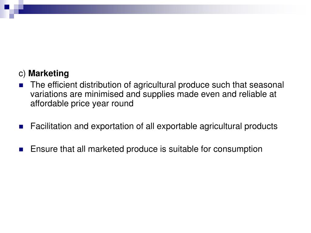 c) Marketing • The efficient distribution of agricultural produce such that seasonal variations are minimised and supplies made even and reliable at affordable price year round • Facilitation and exportation of all exportable agricultural products • Ensure that all marketed produce is suitable for consumption