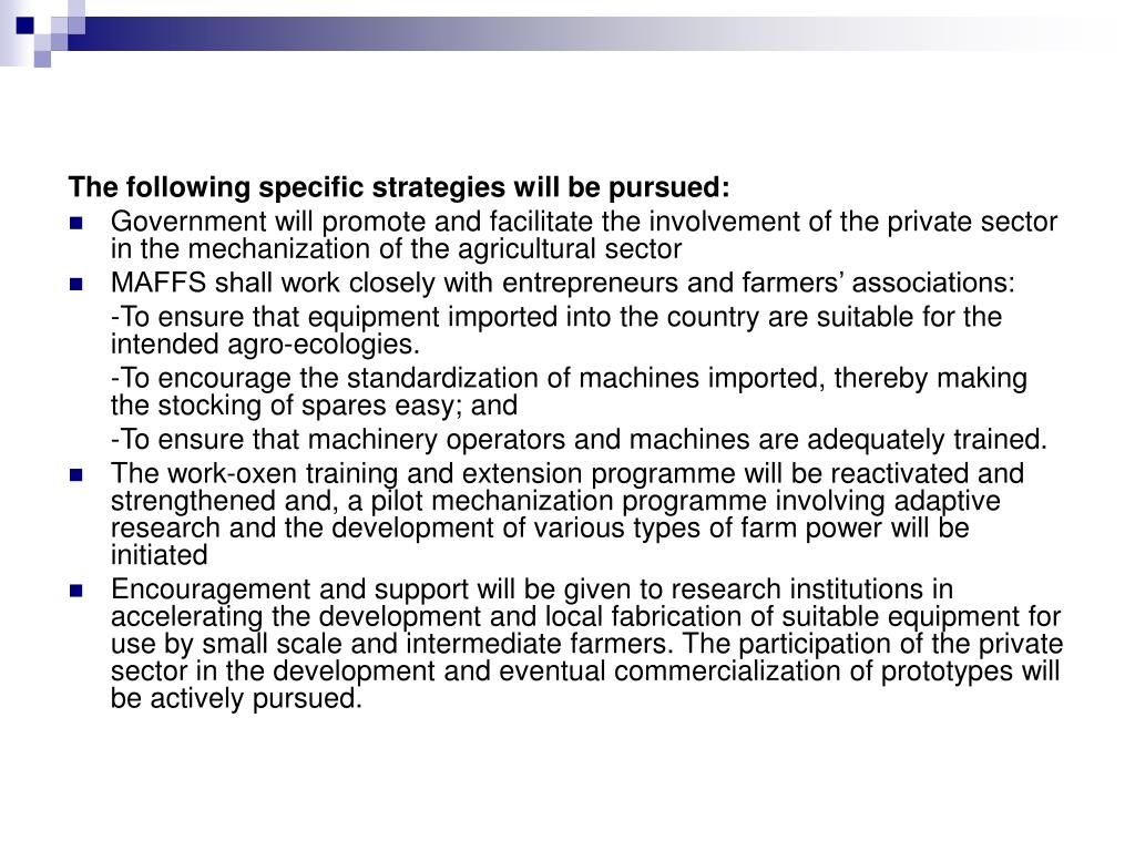 The following specific strategies will be pursued: • Government will promote and facilitate the involvement of the private sector in the mechanization of the agricultural sector • MAFFS shall work closely with entrepreneurs and farmers’ associations: -To ensure that equipment imported into the country are suitable for the intended agro-ecologies. -To encourage the standardization of machines imported, thereby making the stocking of spares easy; and -To ensure that machinery operators and machines are adequately trained. • The work-oxen training and extension programme will be reactivated and strengthened and, a pilot mechanization programme involving adaptive research and the development of various types of farm power will be initiated • Encouragement and support will be given to research institutions in accelerating the development and local fabrication of suitable equipment for use by small scale and intermediate farmers. The participation of the private sector in the development and eventual commercialization of prototypes will be actively pursued.
