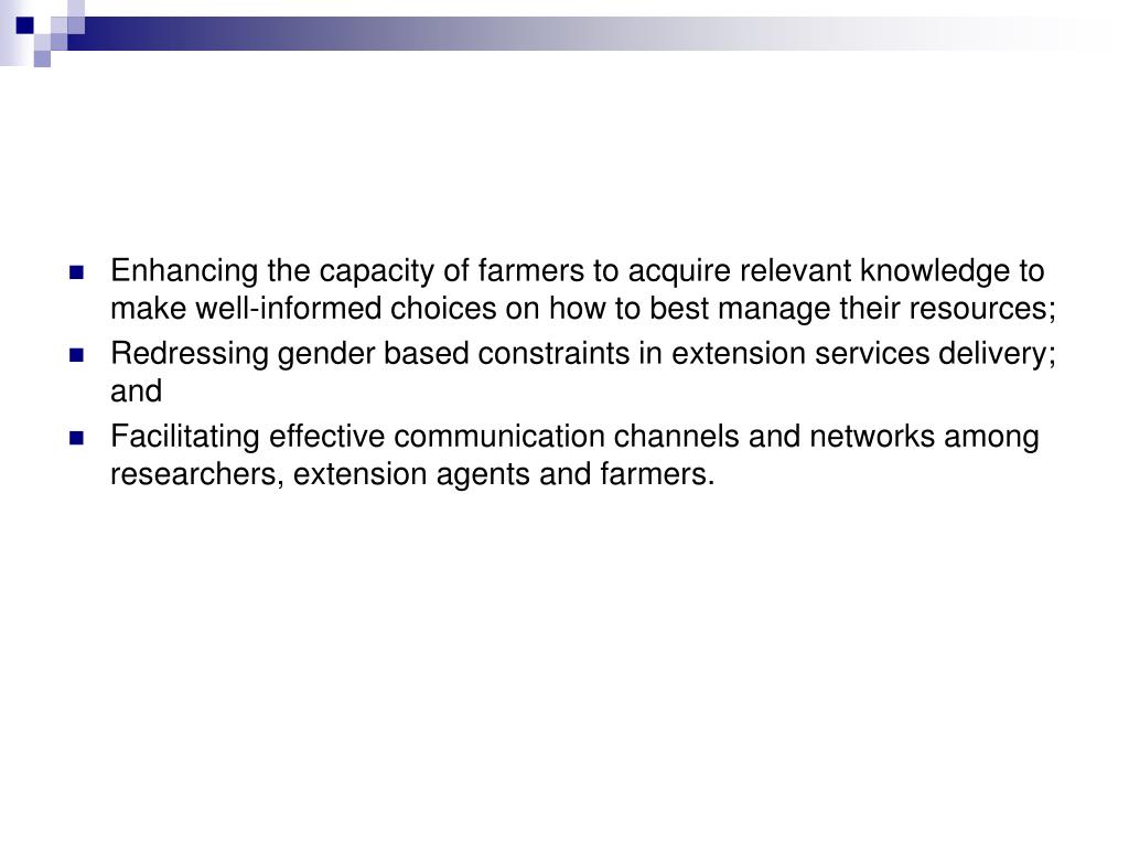 Enhancing the capacity of farmers to acquire relevant knowledge to make well-informed choices on how to best manage their resources; • Redressing gender based constraints in extension services delivery; and • Facilitating effective communication channels and networks among researchers, extension agents and farmers.