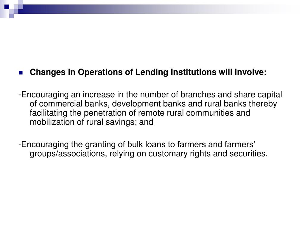 Changes in Operations of Lending Institutions will involve: -Encouraging an increase in the number of branches and share capital of commercial banks, development banks and rural banks thereby facilitating the penetration of remote rural communities and mobilization of rural savings; and -Encouraging the granting of bulk loans to farmers and farmers’ groups/associations, relying on customary rights and securities.