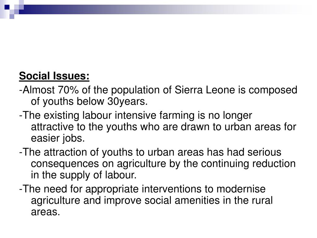 Social Issues: -Almost 70% of the population of Sierra Leone is composed of youths below 30years. -The existing labour intensive farming is no longer attractive to the youths who are drawn to urban areas for easier jobs. -The attraction of youths to urban areas has had serious consequences on agriculture by the continuing reduction in the supply of labour. -The need for appropriate interventions to modernise agriculture and improve social amenities in the rural areas.