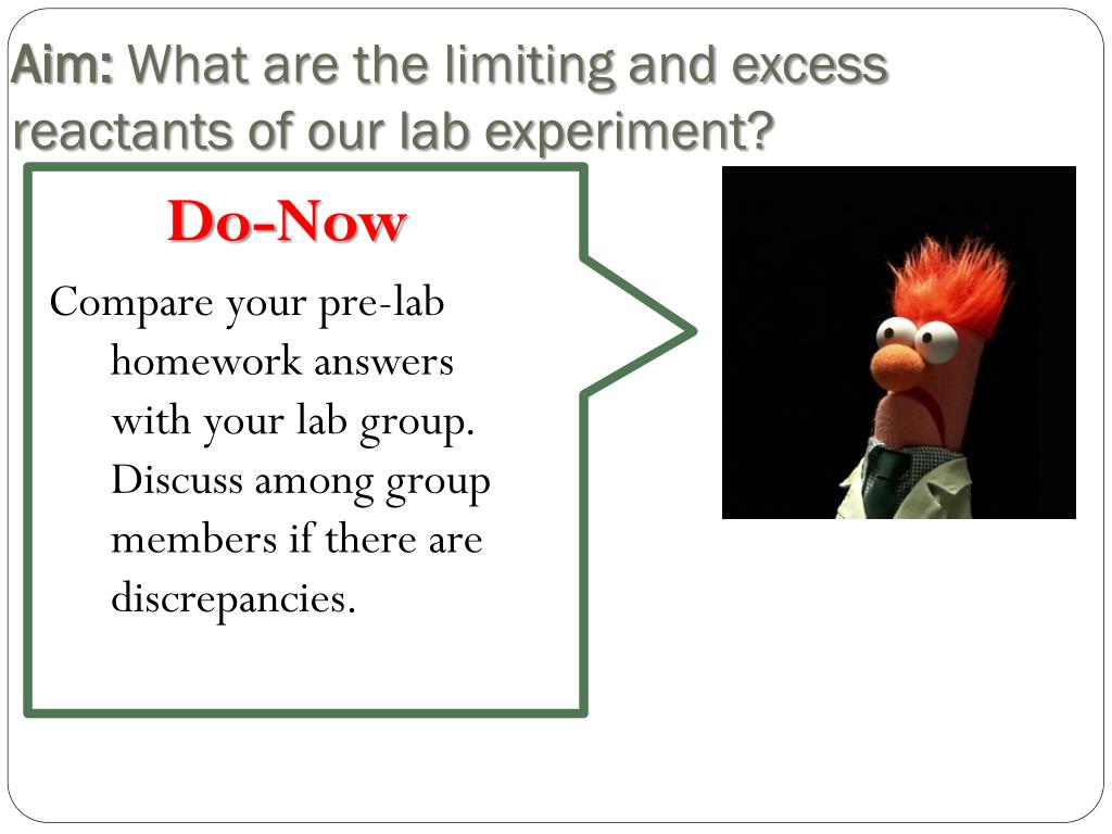 Aim: What are the limiting and excess reactants of our lab experiment? Do-Now Compare your pre-lab homework answers with your lab group. Discuss among group members if there are discrepancies.