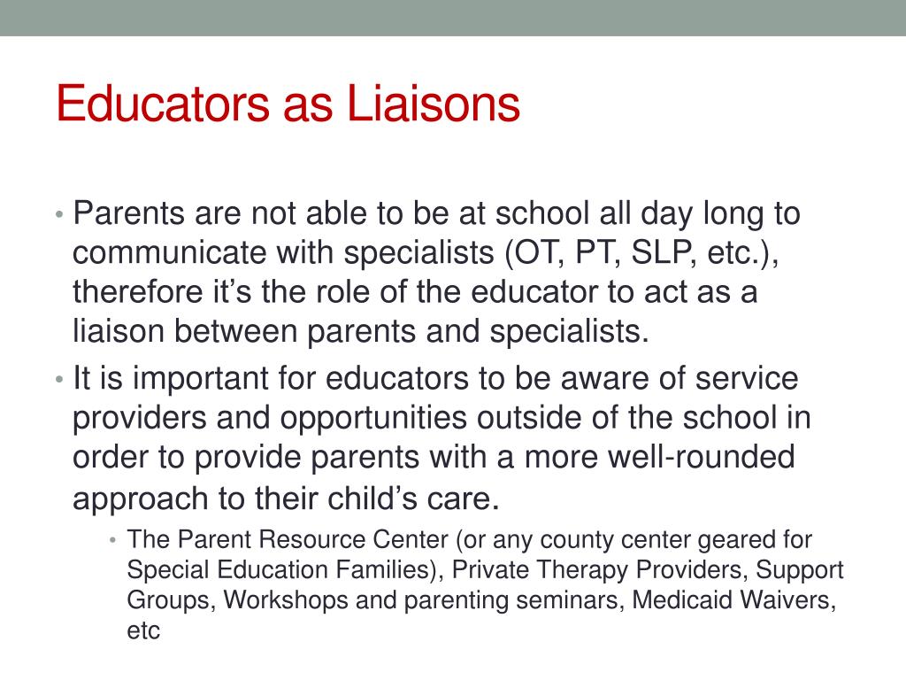 Educators as Liaisons • Parents are not able to be at school all day long to communicate with specialists (OT, PT, SLP, etc.), therefore it’s the role of the educator to act as a liaison between parents and specialists. • It is important for educators to be aware of service providers and opportunities outside of the school in order to provide parents with a more well-rounded approach to their child’s care. • The Parent Resource Center (or any county center geared for Special Education Families), Private Therapy Providers, Support Groups, Workshops and parenting seminars, Medicaid Waivers, etc