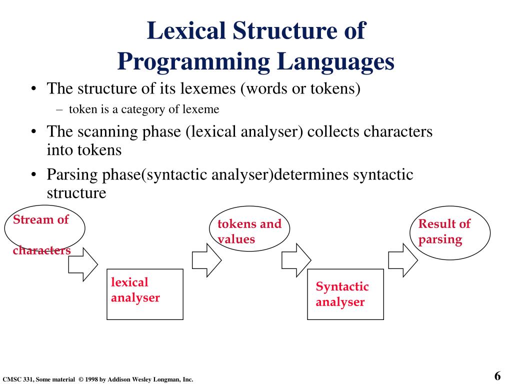 The structure of its lexemes (words or tokens) token is a category of lexeme The scanning phase (lexical analyser) collects characters into tokens Parsing phase(syntactic analyser)determines syntactic structure Lexical Structure of Programming Languages Stream of characters tokens and values Result of parsing lexical analyser Syntactic analyser