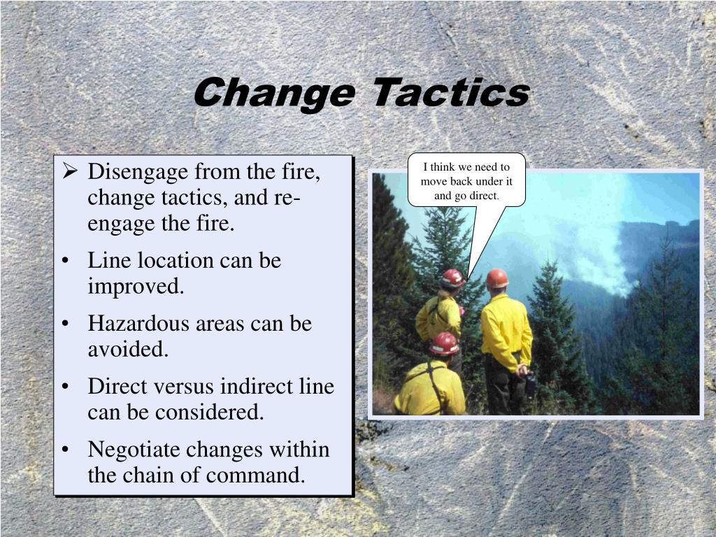 Change Tactics I think we need to move back under it and go direct. • Disengage from the fire, change tactics, and re-engage the fire. • Line location can be improved. • Hazardous areas can be avoided. • Direct versus indirect line can be considered. • Negotiate changes within the chain of command.