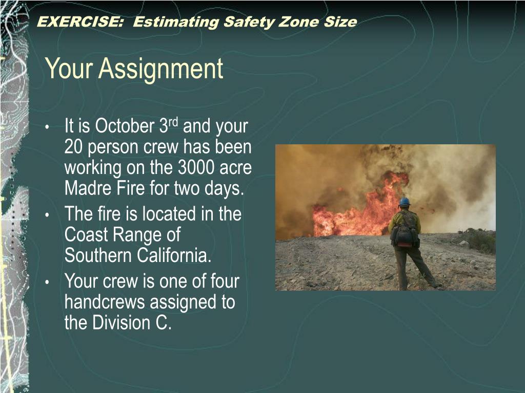 EXERCISE: Estimating Safety Zone Size Your Assignment • It is October 3rd and your 20 person crew has been working on the 3000 acre Madre Fire for two days. • The fire is located in the Coast Range of Southern California. • Your crew is one of four handcrews assigned to the Division C.