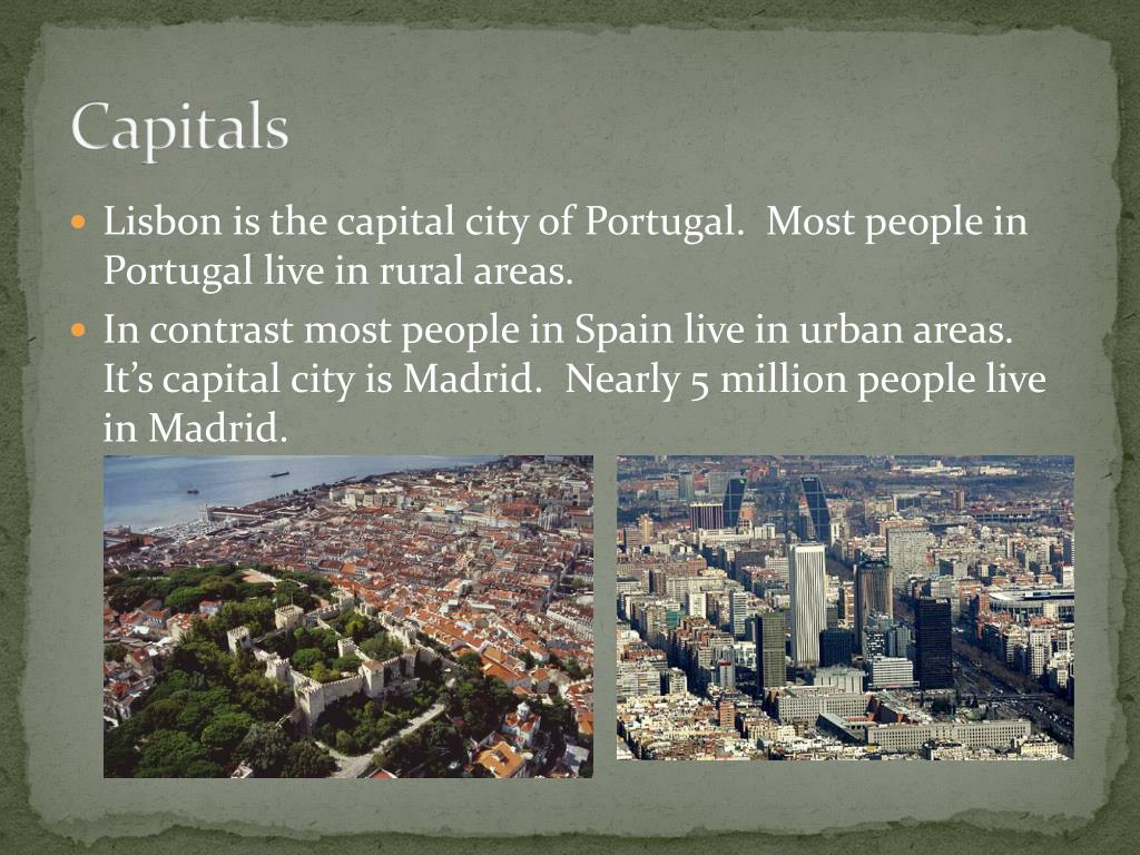 Capitals • Lisbon is the capital city of Portugal. Most people in Portugal live in rural areas. • In contrast most people in Spain live in urban areas. It’s capital city is Madrid. Nearly 5 million people live in Madrid.