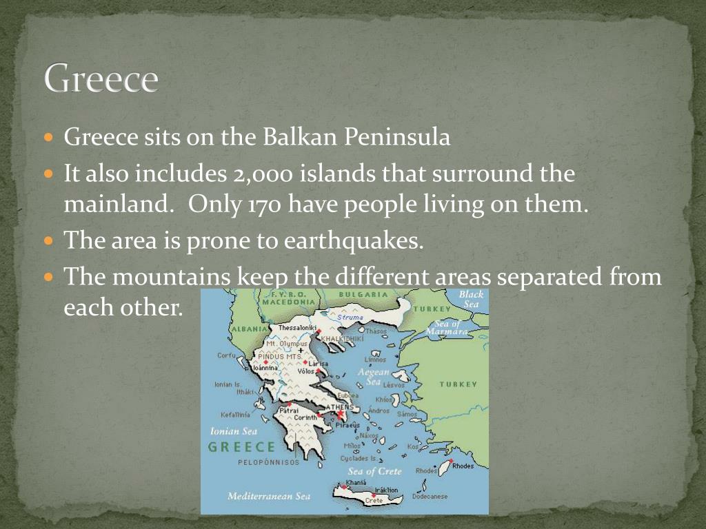 Greece • Greece sits on the Balkan Peninsula • It also includes 2,000 islands that surround the mainland. Only 170 have people living on them. • The area is prone to earthquakes. • The mountains keep the different areas separated from each other.
