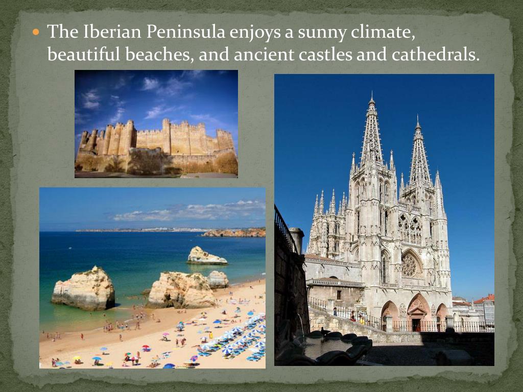 The Iberian Peninsula enjoys a sunny climate, beautiful beaches, and ancient castles and cathedrals.