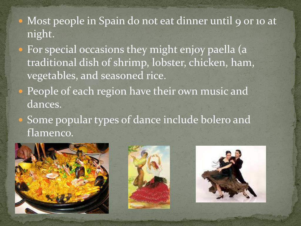 Most people in Spain do not eat dinner until 9 or 10 at night. • For special occasions they might enjoy paella (a traditional dish of shrimp, lobster, chicken, ham, vegetables, and seasoned rice. • People of each region have their own music and dances. • Some popular types of dance include bolero and flamenco.