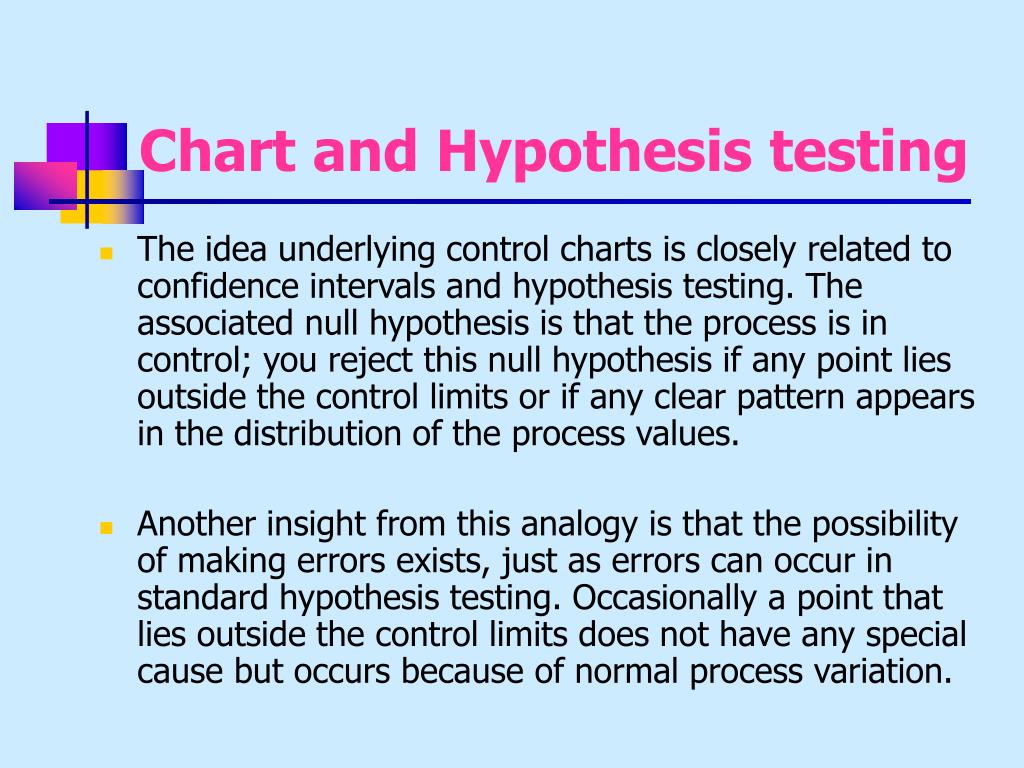 Chart and Hypothesis testing • The idea underlying control charts is closely related to confidence intervals and hypothesis testing. The associated null hypothesis is that the process is in control; you reject this null hypothesis if any point lies outside the control limits or if any clear pattern appears in the distribution of the process values. • Another insight from this analogy is that the possibility of making errors exists, just as errors can occur in standard hypothesis testing. Occasionally a point that lies outside the control limits does not have any special cause but occurs because of normal process variation.