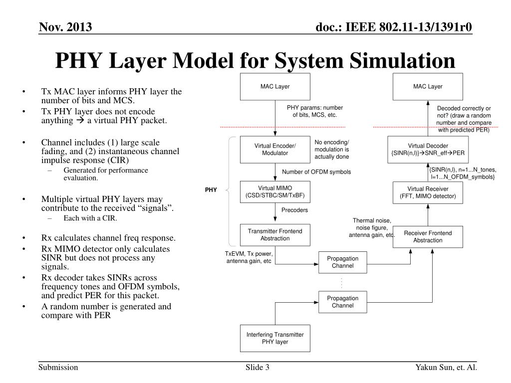 PHY Layer Model for System Simulation • Tx MAC layer informs PHY layer the number of bits and MCS. • Tx PHY layer does not encode anything a virtual PHY packet. • Channel includes (1) large scale fading, and (2) instantaneous channel impulse response (CIR) • Generated for performance evaluation. • Multiple virtual PHY layers may contribute to the received “signals”. • Each with a CIR. • Rx calculates channel freq response. • Rx MIMO detector only calculates SINR but does not process any signals. • Rx decoder takes SINRs across frequency tones and OFDM symbols, and predict PER for this packet. • A random number is generated and compare with PER Yakun Sun, et. Al.