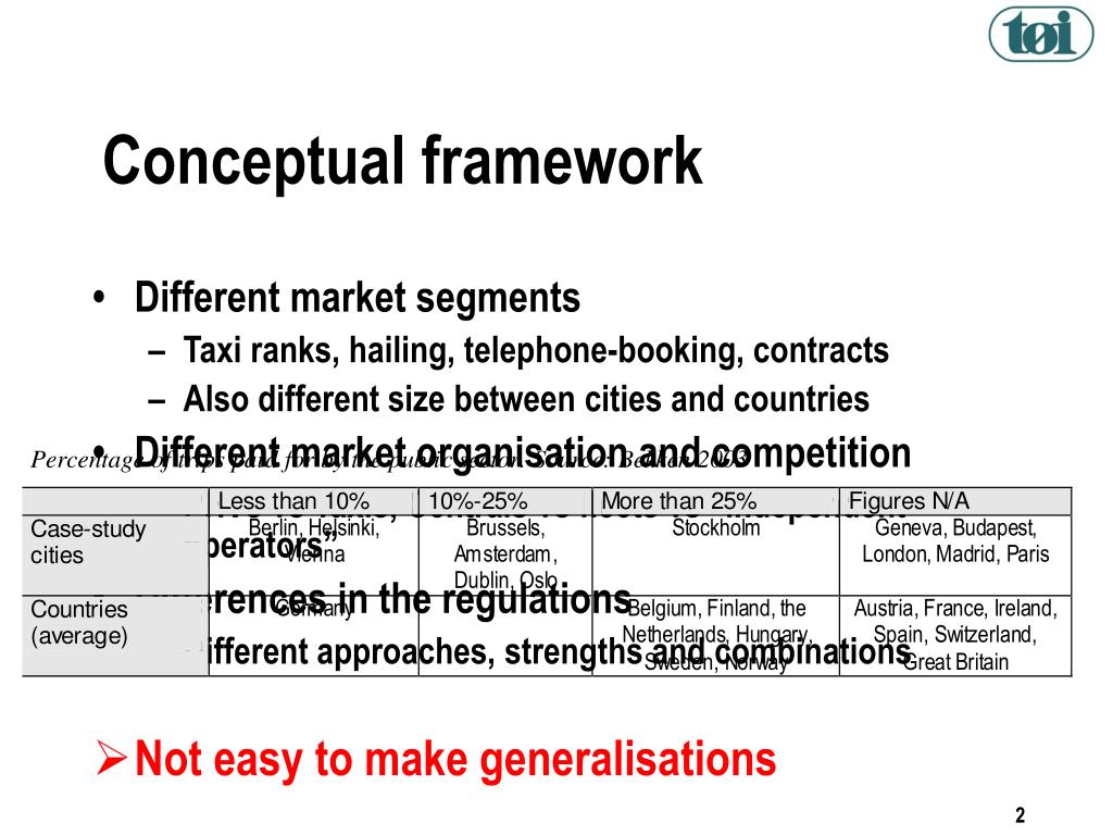 Conceptual framework • Different market segments • Taxi ranks, hailing, telephone-booking, contracts • Also different size between cities and countries • Different market organisation and competition • PHVs vs Taxis, Centrals vs fleets vs “independent operators” • Differences in the regulations • Different approaches, strengths and combinations • Not easy to make generalisations