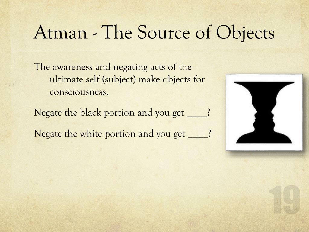 Atman - The Source of Objects The awareness and negating acts of the ultimate self (subject) make objects for consciousness. Negate the black portion and you get ____? Negate the white portion and you get ____?