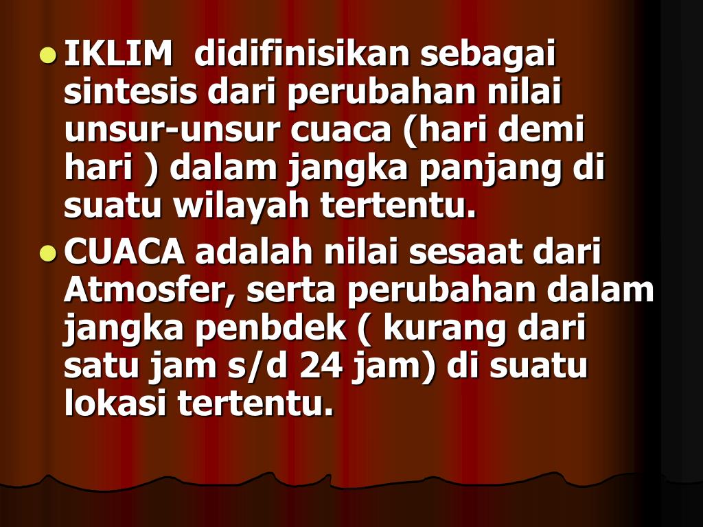 IKLIM didifinisikan sebagai sintesis dari perubahan nilai unsur-unsur cuaca (hari demi hari ) dalam jangka panjang di suatu wilayah tertentu. • CUACA adalah nilai sesaat dari Atmosfer, serta perubahan dalam jangka penbdek ( kurang dari satu jam s/d 24 jam) di suatu lokasi tertentu.