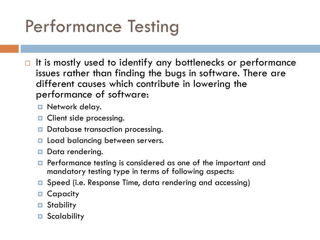 Performance Testing • It is mostly used to identify any bottlenecks or performance issues rather than finding the bugs in software. There are different causes which contribute in lowering the performance of software: • Network delay. • Client side processing. • Database transaction processing. • Load balancing between servers. • Data rendering. • Performance testing is considered as one of the important and mandatory testing type in terms of following aspects: • Speed (i.e. Response Time, data rendering and accessing) • Capacity • Stability • Scalability