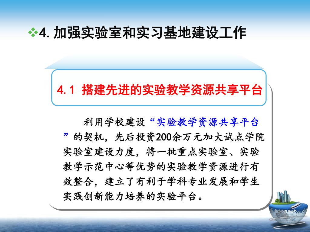 4.加强实验室和实习基地建设工作 4.1 搭建先进的实验教学资源共享平台 利用学校建设“实验教学资源共享平台”的契机,先后投资200余万元加大试点学院实验室建设力度,将一批重点实验室、实验教学示范中心等优势的实验教学资源进行有效整合,建立了有利于学科专业发展和学生实践创新能力培养的实验平台。