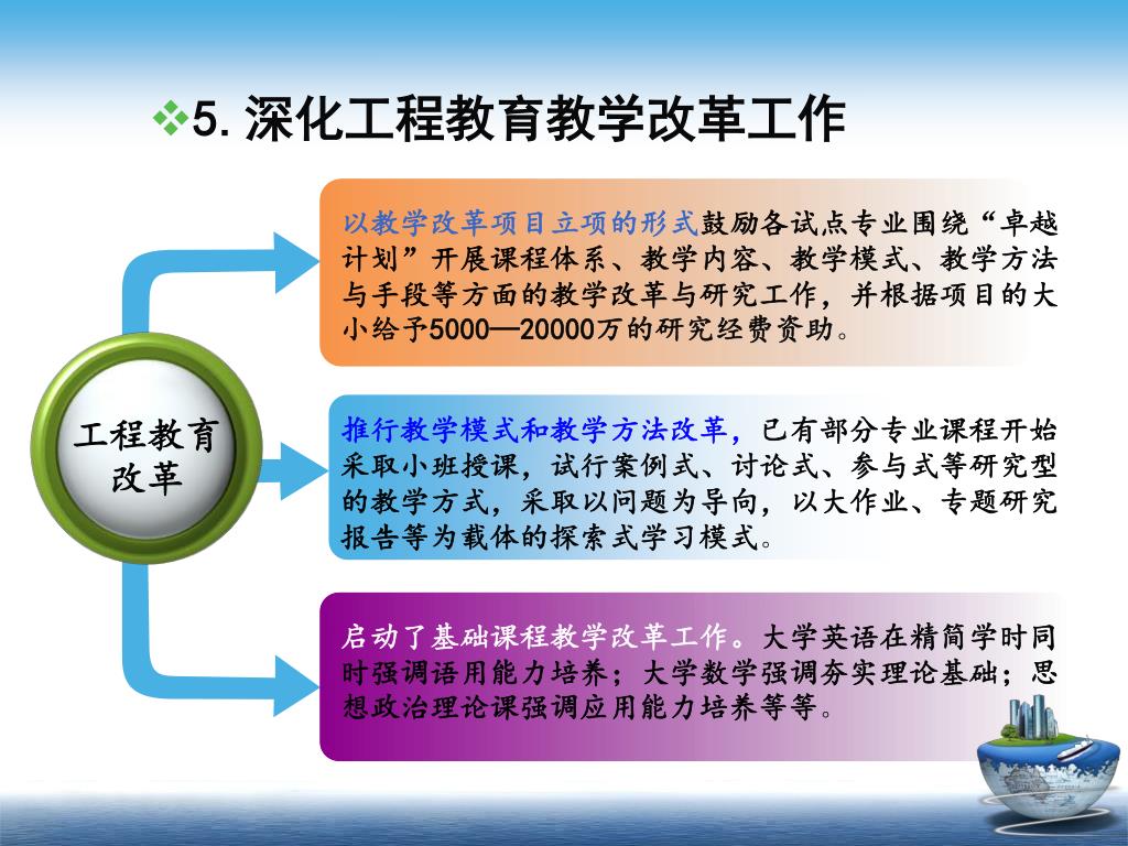 5.深化工程教育教学改革工作 以教学改革项目立项的形式鼓励各试点专业围绕“卓越计划”开展课程体系、教学内容、教学模式、教学方法与手段等方面的教学改革与研究工作,并根据项目的大小给予5000—20000万的研究经费资助。 工程教育改革 推行教学模式和教学方法改革,已有部分专业课程开始采取小班授课,试行案例式、讨论式、参与式等研究型的教学方式,采取以问题为导向,以大作业、专题研究报告等为载体的探索式学习模式。 启动了基础课程教学改革工作。大学英语在精简学时同时强调语用能力培养;大学数学强调夯实理论基础;思想政治理论课强调应用能力培养等等。