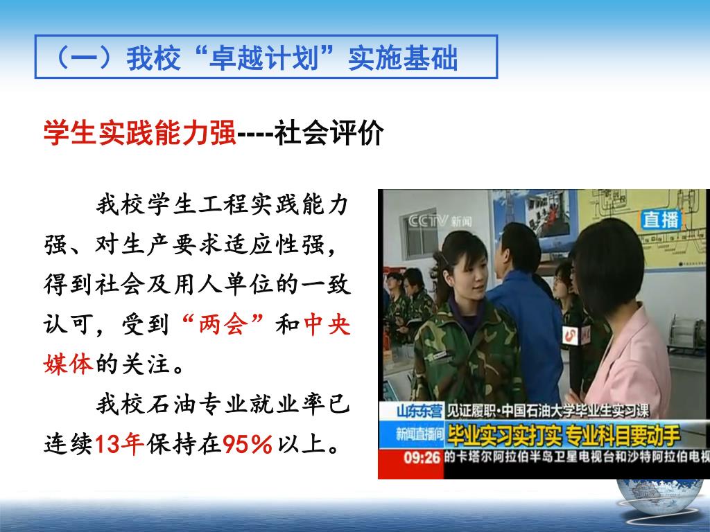 (一)我校“卓越计划”实施基础 学生实践能力强----社会评价 我校学生工程实践能力强、对生产要求适应性强,得到社会及用人单位的一致认可,受到“两会”和中央媒体的关注。 我校石油专业就业率已连续13年保持在95%以上。