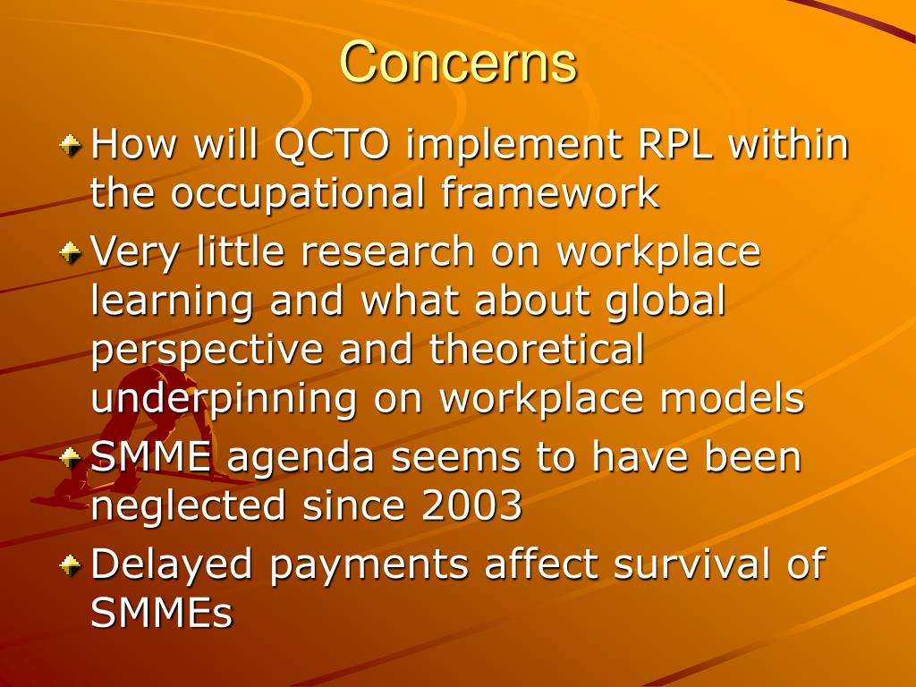 Concerns • How will QCTO implement RPL within the occupational framework • Very little research on workplace learning and what about global perspective and theoretical underpinning on workplace models • SMME agenda seems to have been neglected since 2003 • Delayed payments affect survival of SMMEs