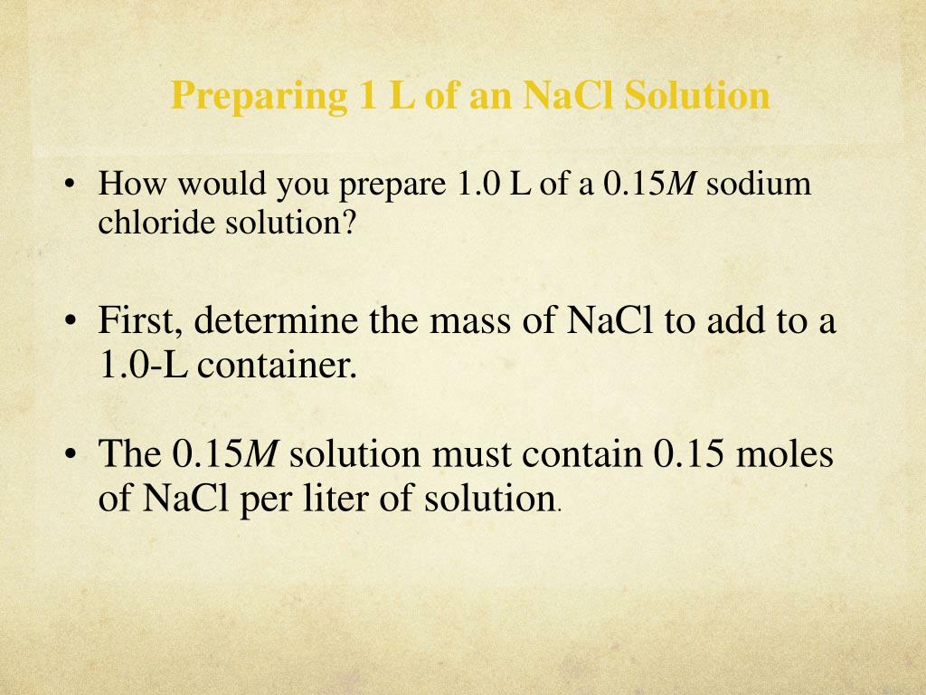 Preparing 1 L of an NaCl Solution • How would you prepare 1.0 L of a 0.15M sodium chloride solution? • First, determine the mass of NaCl to add to a 1.0-L container. • The 0.15M solution must contain 0.15 moles of NaCl per liter of solution.