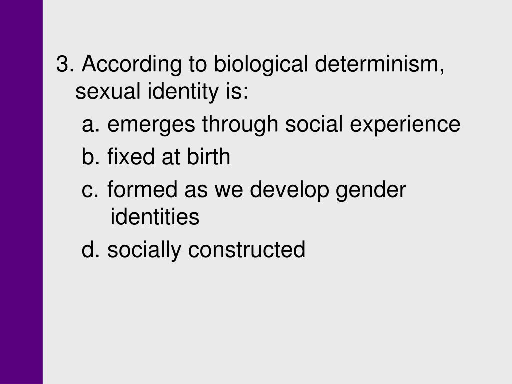 3. According to biological determinism, sexual identity is: a. emerges through social experience b. fixed at birth c. formed as we develop gender identities d. socially constructed