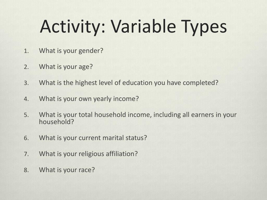 Activity: Variable Types • What is your gender? • What is your age? • What is the highest level of education you have completed? • What is your own yearly income? • What is your total household income, including all earners in your household? • What is your current marital status? • What is your religious affiliation? • What is your race?