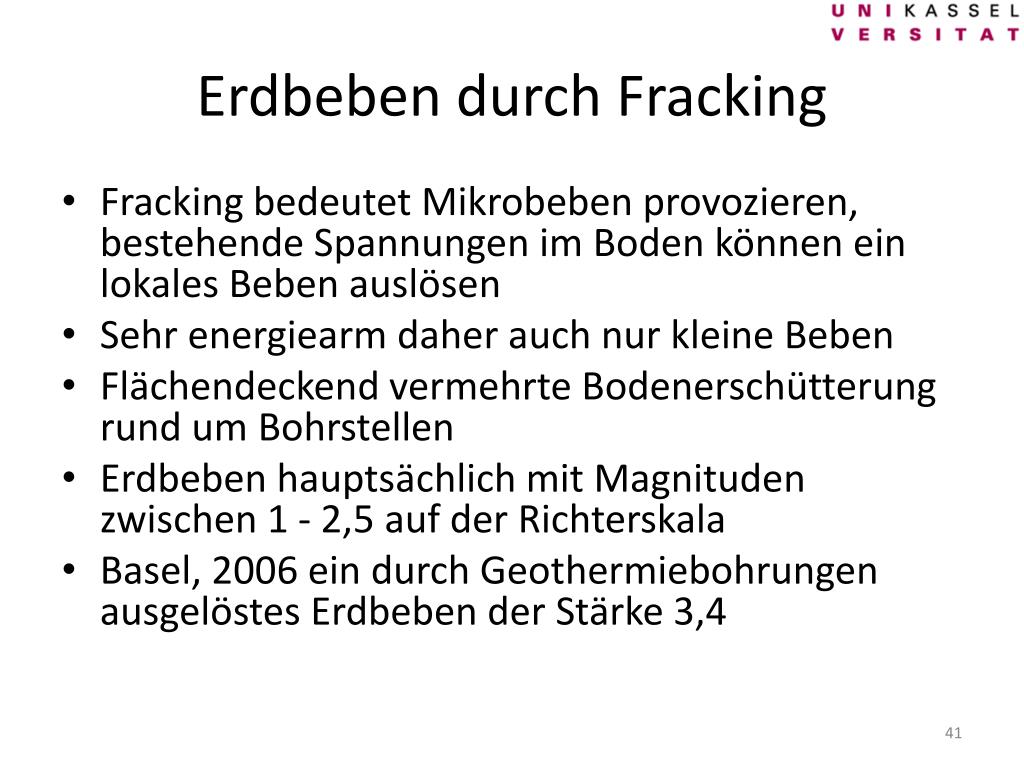 Erdbeben durch Fracking • Fracking bedeutet Mikrobeben provozieren, bestehende Spannungen im Boden können ein lokales Beben auslösen • Sehr energiearm daher auch nur kleine Beben • Flächendeckend vermehrte Bodenerschütterung rund um Bohrstellen • Erdbeben hauptsächlich mit Magnituden zwischen 1 - 2,5 auf der Richterskala • Basel, 2006 ein durch Geothermiebohrungenausgelöstes Erdbeben der Stärke 3,4