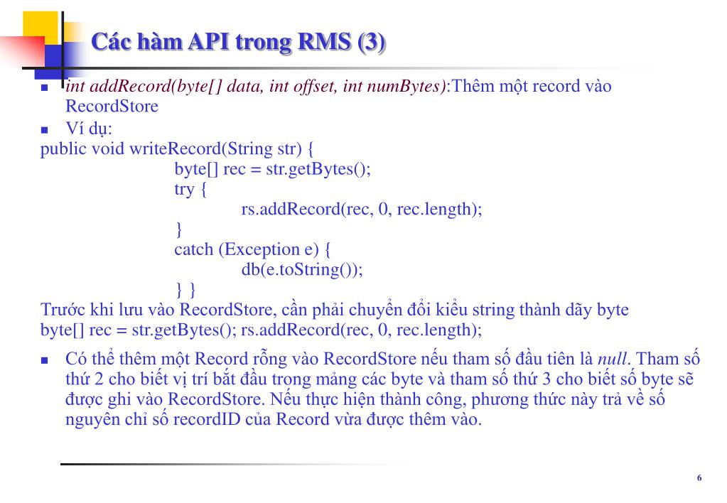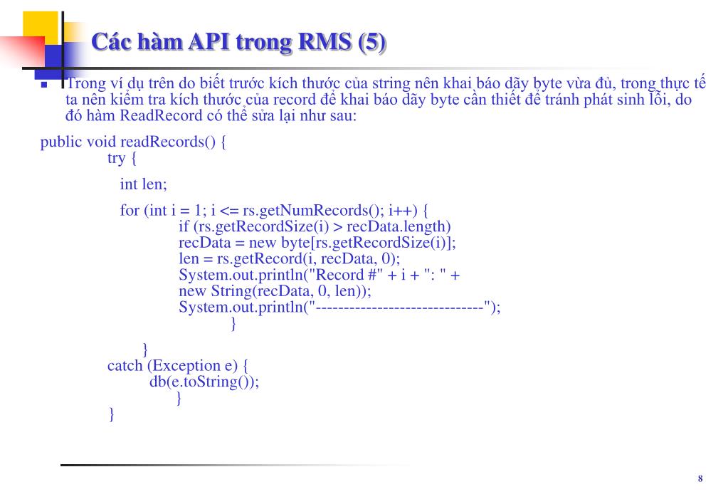 Các hàm API trong RMS (5) • Trong ví dụ trên do biết trước kích thước của string nên khai báo dãy byte vừa đủ, trong thực tế ta nên kiểm tra kích thước của record để khai báo dãy byte cần thiết để tránh phát sinh lỗi, do đó hàm ReadRecord có thể sửa lại như sau: public void readRecords() { try { int len; for (int i = 1; i <= rs.getNumRecords(); i++) { if (rs.getRecordSize(i) > recData.length) recData = new byte[rs.getRecordSize(i)]; len = rs.getRecord(i, recData, 0); System.out.println("Record #" + i + ": " + new String(recData, 0, len)); System.out.println("------------------------------"); } } catch (Exception e) { db(e.toString()); } }