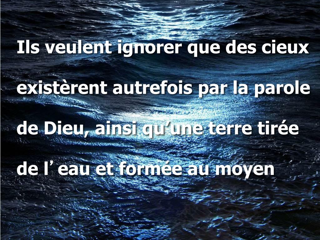 Ils veulent ignorer que des cieux existèrent autrefois par la parole de Dieu, ainsi qu’une terre tirée de l’eau et formée au moyen