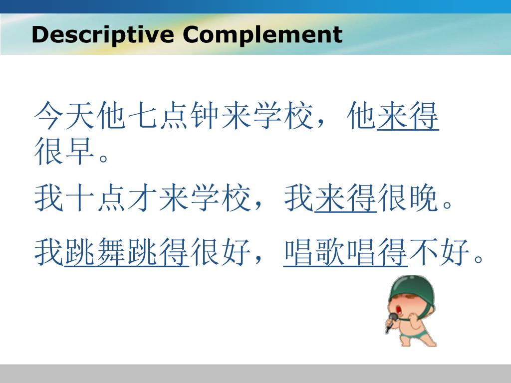Descriptive Complement 今天他七点钟来学校,他来得很早。 我十点才来学校,我来得很晚。 我跳舞跳得很好,唱歌唱得不好。