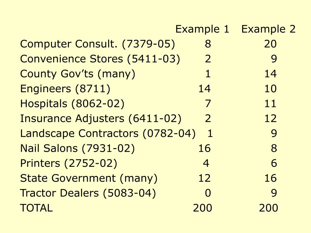 Example 1 Example 2 Computer Consult. (7379-05) 8 20 Convenience Stores (5411-03) 2 9 County Gov’ts (many) 1 14 Engineers (8711) 14 10 Hospitals (8062-02) 7 11 Insurance Adjusters (6411-02) 2 12 Landscape Contractors (0782-04) 1 9 Nail Salons (7931-02) 16 8 Printers (2752-02) 4 6 State Government (many) 12 16 Tractor Dealers (5083-04) 0 9 TOTAL 200 200