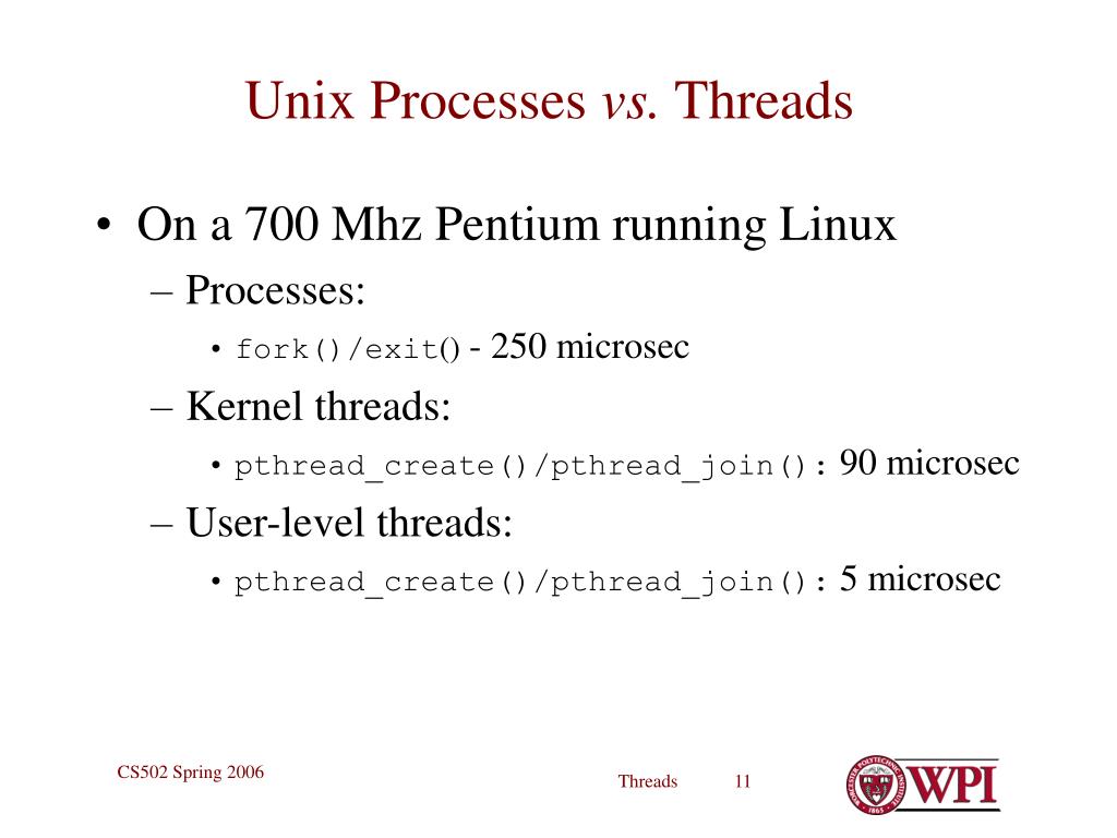 Unix Processes vs. Threads • On a 700 Mhz Pentium running Linux • Processes: • fork()/exit() - 250 microsec • Kernel threads: • pthread_create()/pthread_join(): 90 microsec • User-level threads: • pthread_create()/pthread_join(): 5 microsec CS502 Spring 2006