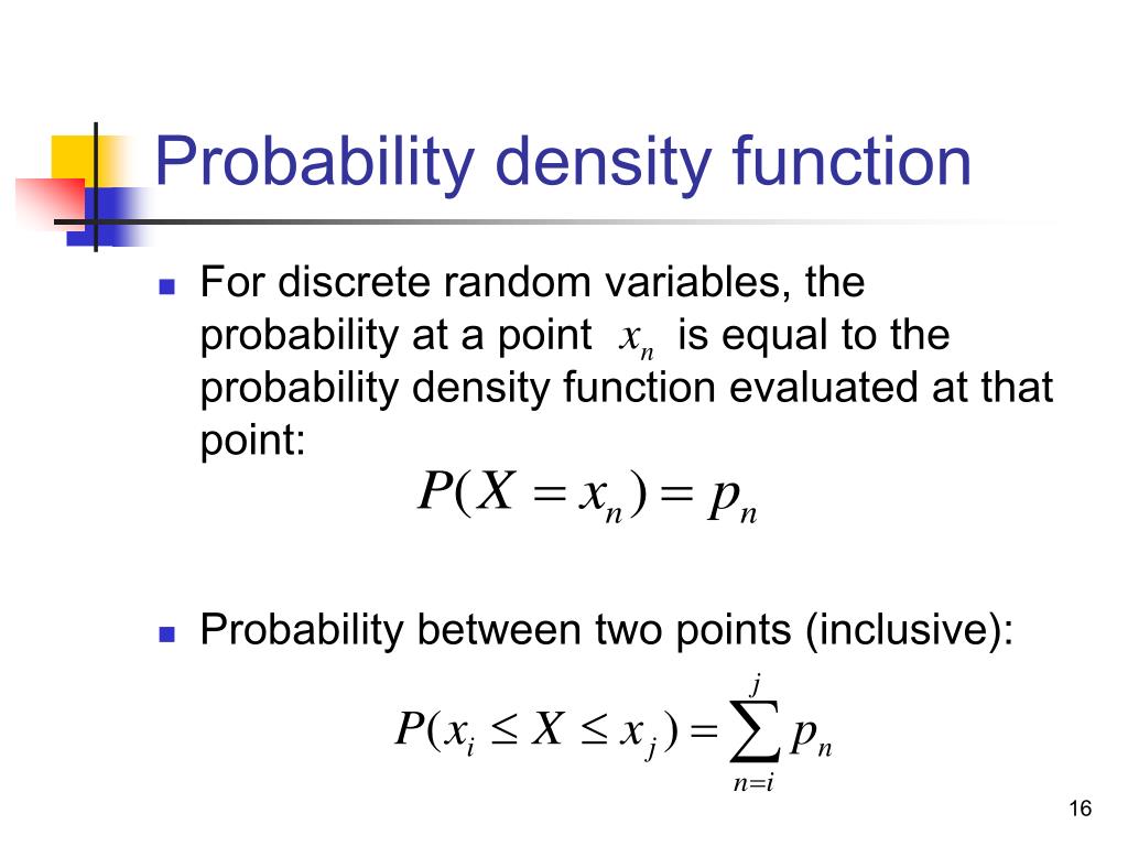 Probability density function • For discrete random variables, the probability at a point is equal to the probability density function evaluated at that point: • Probability between two points (inclusive):