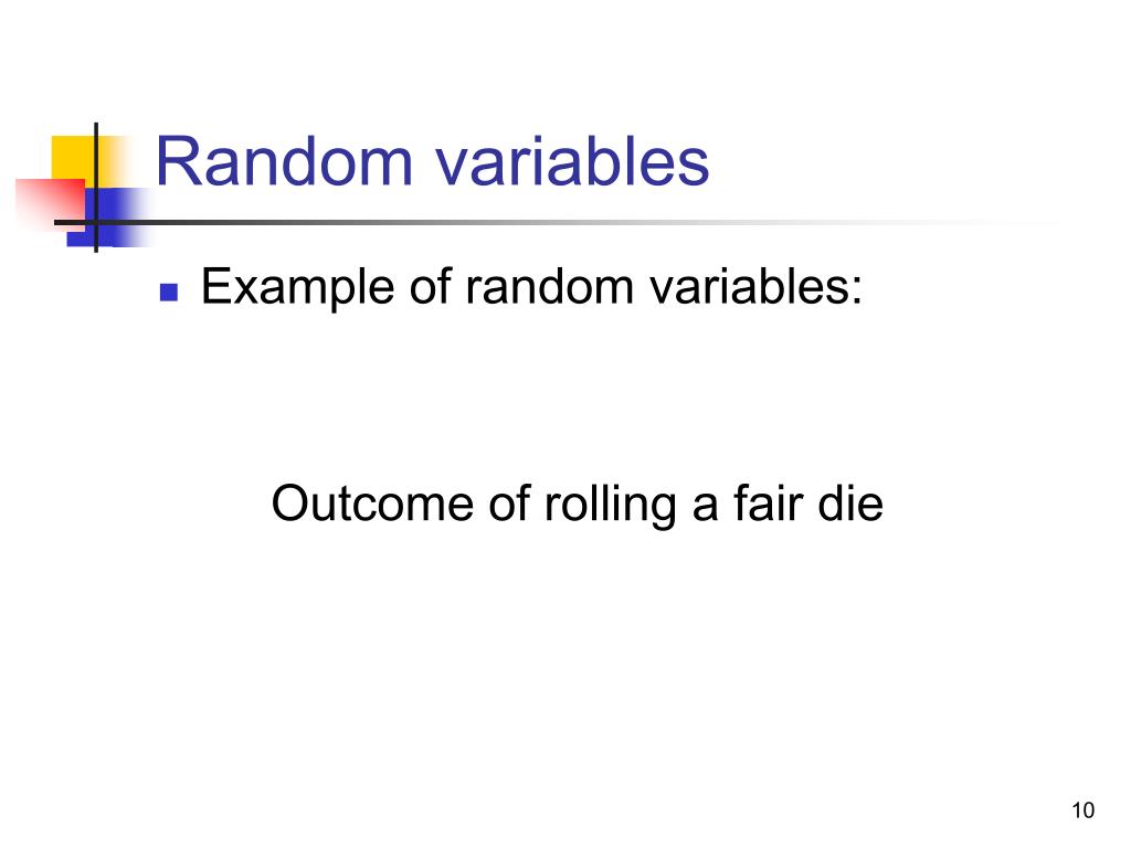 Random variables • Example of random variables: Outcome of rolling a fair die