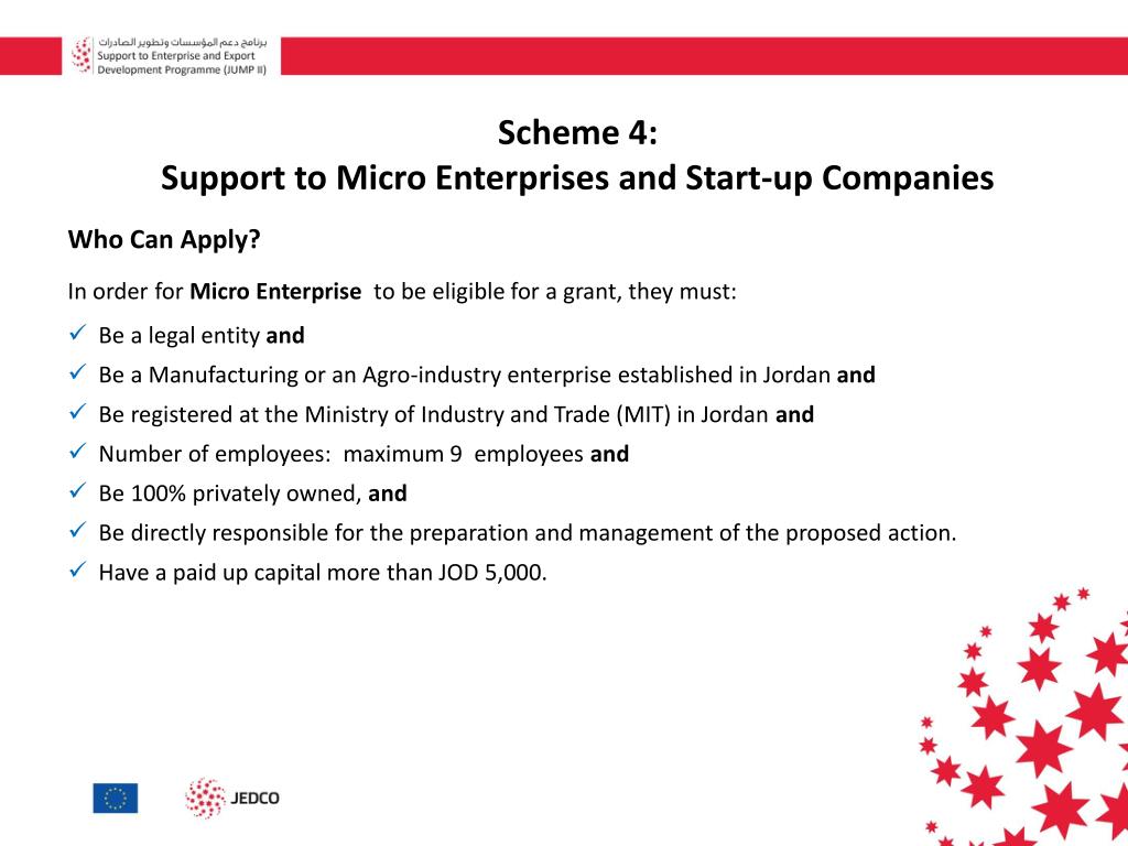 Scheme 4: Support to Micro Enterprises and Start-up Companies • Who Can Apply? In order for Start-up Enterprise to be eligible for a grant, they must: • Be a physical person and • Be a Manufacturing or an Agro-industry enterprise to be established in Jordan and • Be 100% privately owned, and • Be directly responsible for the preparation and management of the proposed action.