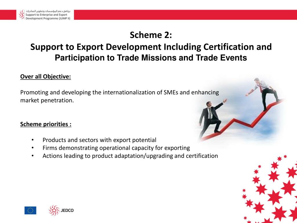 Scheme 2: Support to Export Development Including Certification and Participation to Trade Missions and Trade Events • Over all Objective: • Promoting and developing the internationalization of SMEs and enhancing • market penetration. • Scheme priorities : • Products and sectors with export potential • Firms demonstrating operational capacity for exporting • Actions leading to product adaptation/upgrading and certification