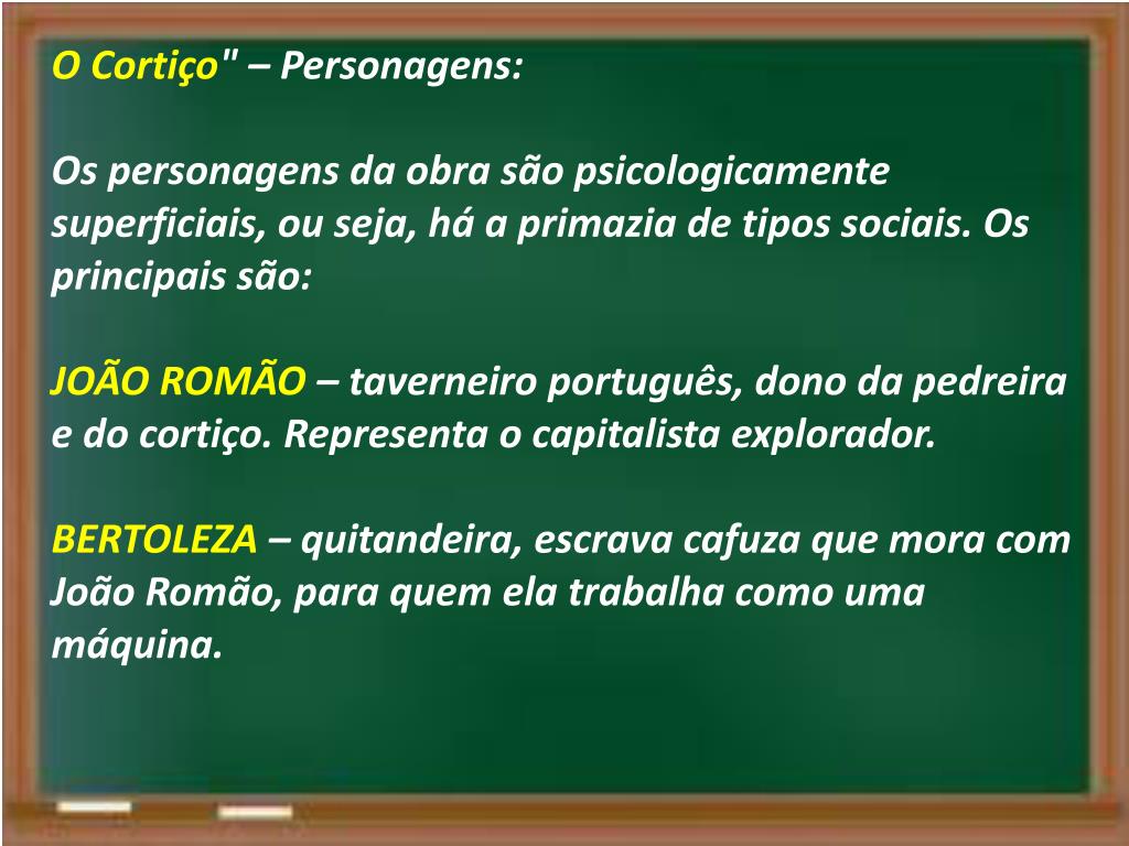 O Cortiço" – Personagens: Os personagens da obra são psicologicamente superficiais, ou seja, há a primazia de tipos sociais. Os principais são: JOÃO ROMÃO – taverneiro português, dono da pedreira e do cortiço. Representa o capitalista explorador. BERTOLEZA – quitandeira, escrava cafuza que mora com João Romão, para quem ela trabalha como uma máquina.