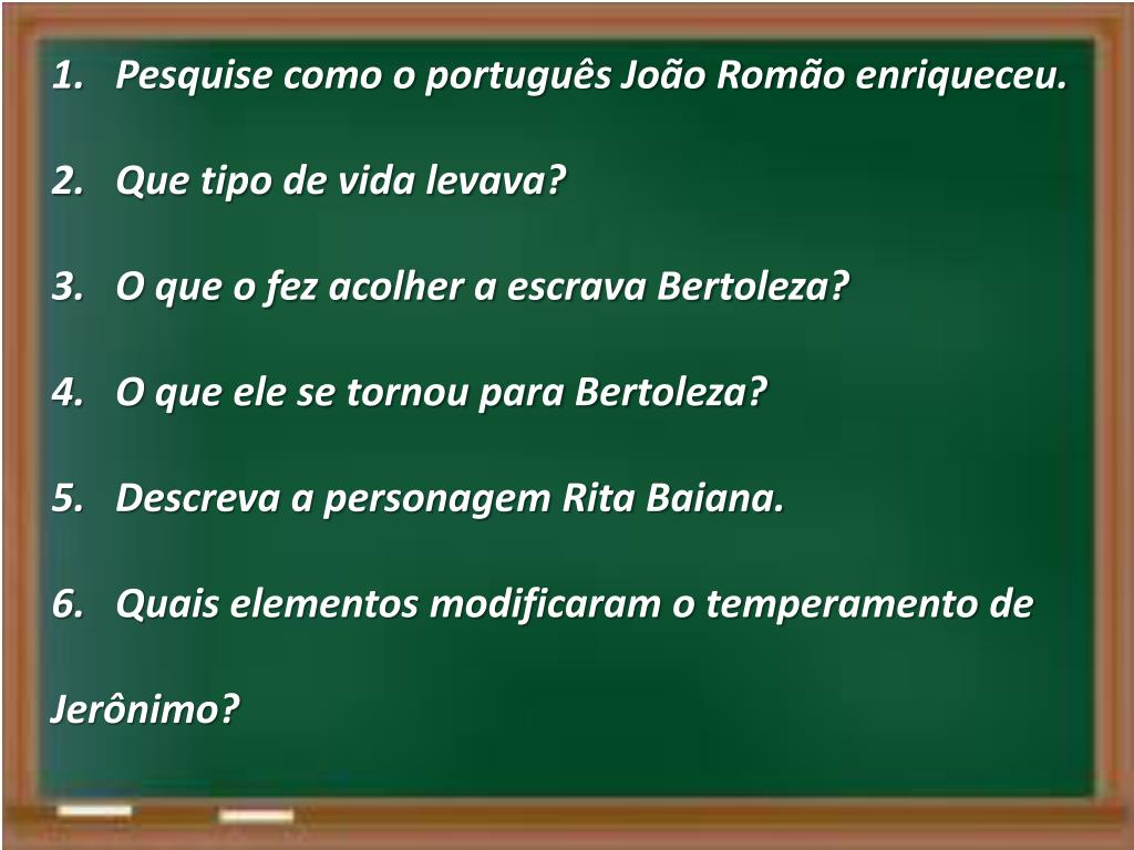 Pesquise como o português João Romão enriqueceu. Que tipo de vida levava? O que o fez acolher a escrava Bertoleza? O que ele se tornou para Bertoleza? Descreva a personagem Rita Baiana. Quais elementos modificaram o temperamento de Jerônimo?