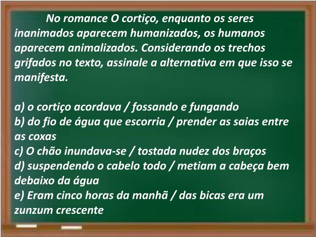 No romance O cortiço, enquanto os seres inanimados aparecem humanizados, os humanos aparecem animalizados. Considerando os trechos grifados no texto, assinale a alternativa em que isso se manifesta. a) o cortiço acordava / fossando e fungando b) do fio de água que escorria / prender as saias entre as coxas c) O chão inundava-se / tostada nudez dos braços d) suspendendo o cabelo todo / metiam a cabeça bem debaixo da água e) Eram cinco horas da manhã / das bicas era um zunzum crescente