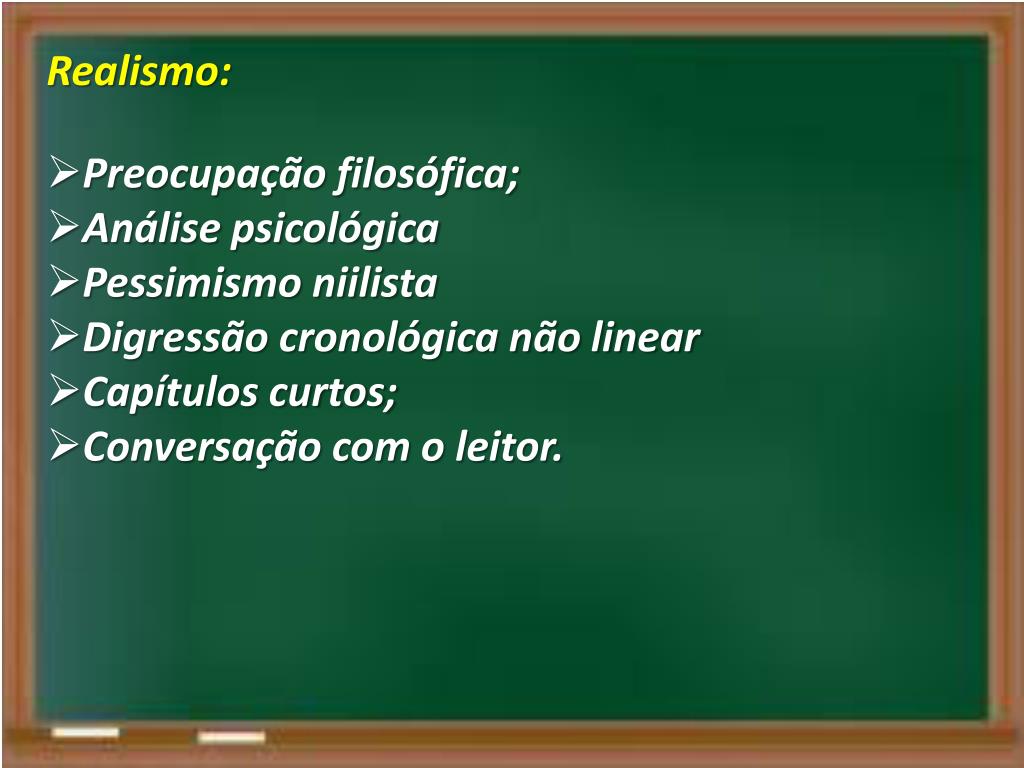 Realismo: • Preocupação filosófica; • Análise psicológica • Pessimismo niilista • Digressão cronológica não linear • Capítulos curtos; • Conversação com o leitor.