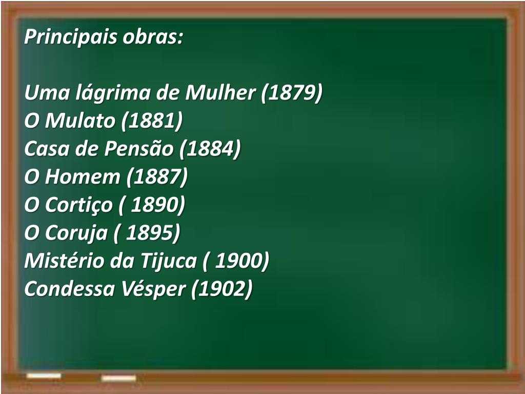 Principais obras: Uma lágrima de Mulher (1879) O Mulato (1881) Casa de Pensão (1884) O Homem (1887) O Cortiço ( 1890) O Coruja ( 1895) Mistério da Tijuca ( 1900) Condessa Vésper (1902)