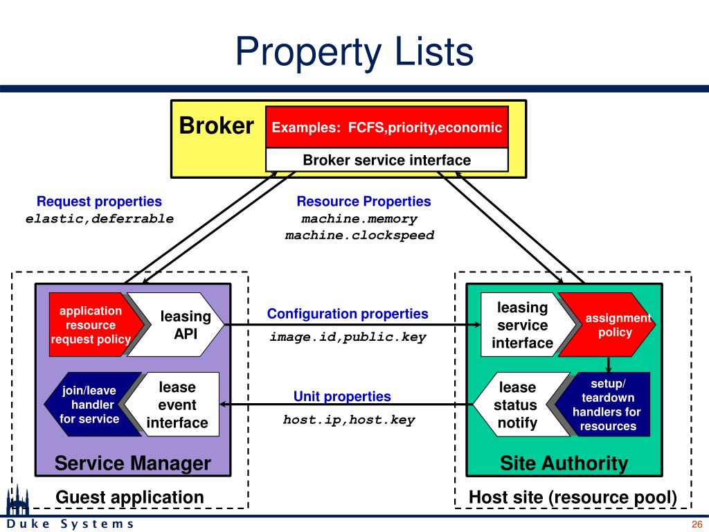 Site Authority Broker Property Lists Examples: FCFS,priority,economic Broker service interface Request properties Resource Properties elastic,deferrable machine.memory machine.clockspeed Guest application Host site (resource pool) Service Manager application resource request policy leasing API leasing service interface assignment policy Configuration properties image.id,public.key join/leave handler for service lease event interface lease status notify setup/ teardown handlers for resources Unit properties host.ip,host.key